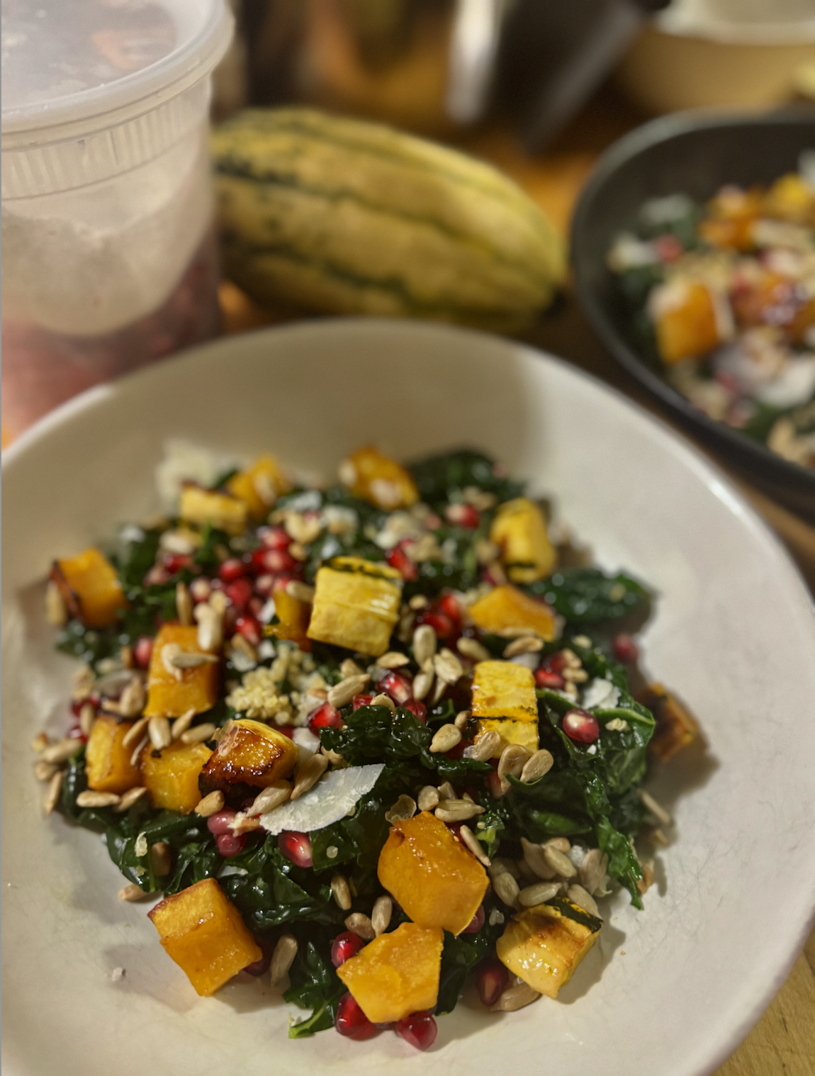 To make the salad: Place the kale in a bowl, add the quinoa, add pomegranate seeds, add squash, add pumpkin/sunflower seeds, use a peeler to grate some Parmesan cheese on top. Spoon over the dressing.
